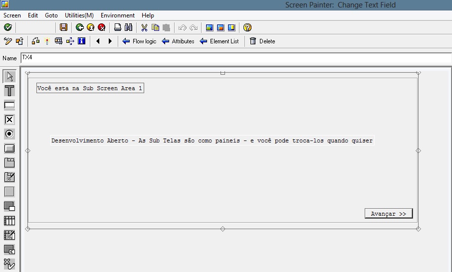 4. Para o botão coloque o function code F_SAIR e nomeie o SubScreenArea de SSA1, nomeie os outros componentes da tela como desejar.