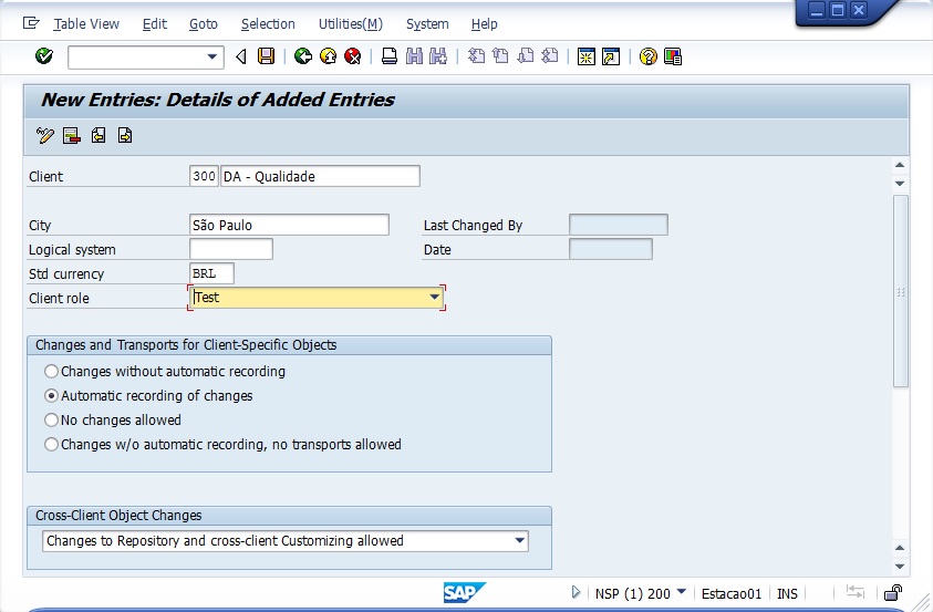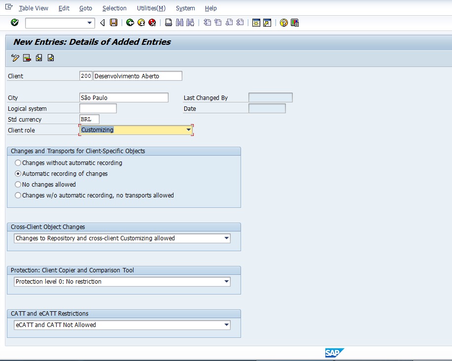 1 – Para criar um novo cliente entre na transação SCC4, clique em Display/Change, clique em OK, no aviso de tabelas Cross-Client(tabelas que não possuem o campo MANDT, apesar desta possuir, é tabela pai dos mandantes para o sistema) e clique em New Entry, inclua um novo cliente com a opção Client Role: Customizing e salve.