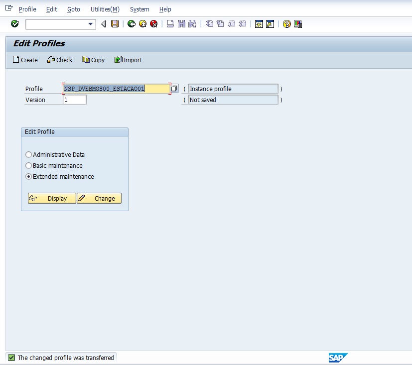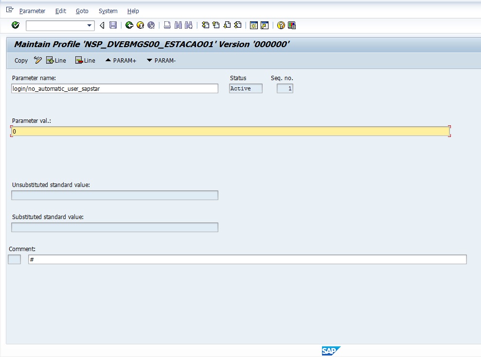 Após o perfil DEFAULT importado, selecione o botão de radio, Extended Maintenance e clique em Change, na tela de parâmetros clique no botão Parameters e preencha o campo Parameter name com: login/no_automatic_user_sapstar e o campo Parameter Val com o valor 0.