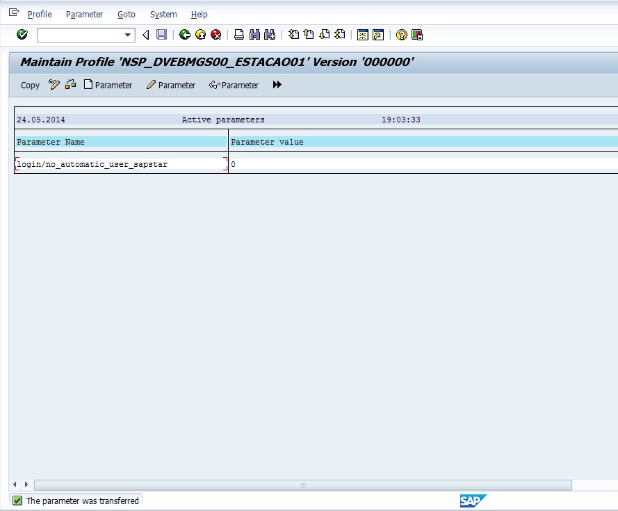- Após executar a modificação ou a inserção do parâmetro: login/no_automatic_user_sapstar
