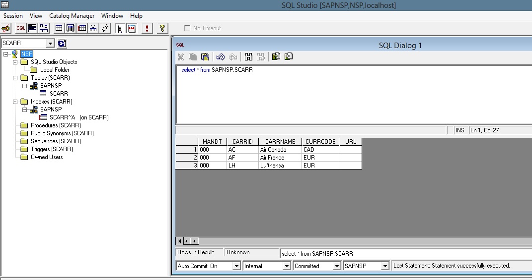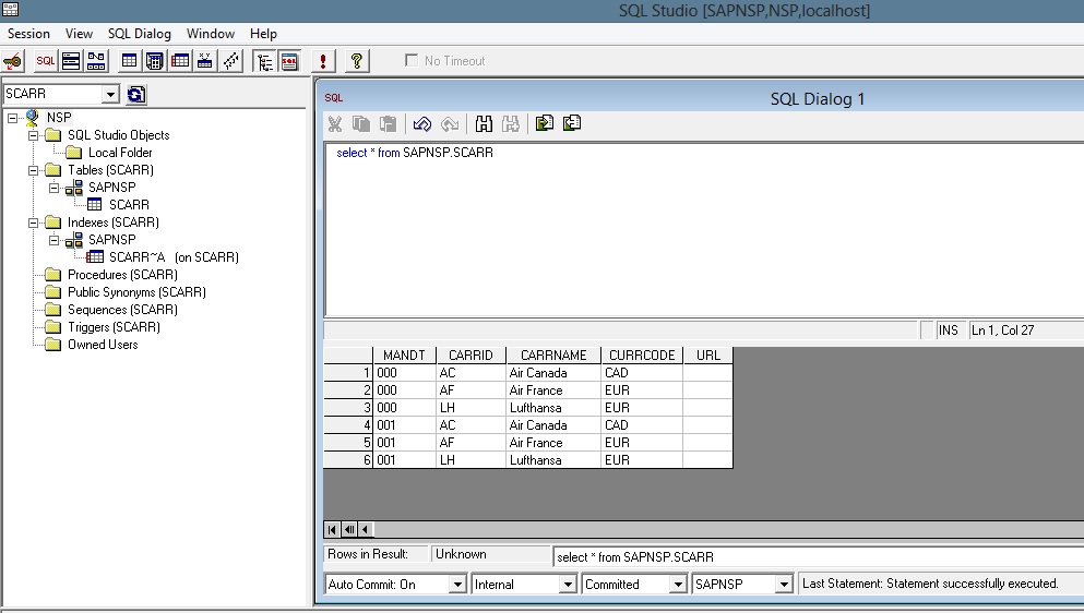 1- Primeiro você precisa de um acesso de DBA e uma ferramenta de SQL do banco de dados utilizado pelo seu sistema SAP, em nosso caso estamos usando o SAP MaxDB e o SQL Studio. Vamos efetuar um comando básico na tabela de exemplo do Flight Model do NetWeaver 7, chamada SCARR e poderemos ver que os dados estão contidos apenas no mandante padrão que é o cliente 000.
