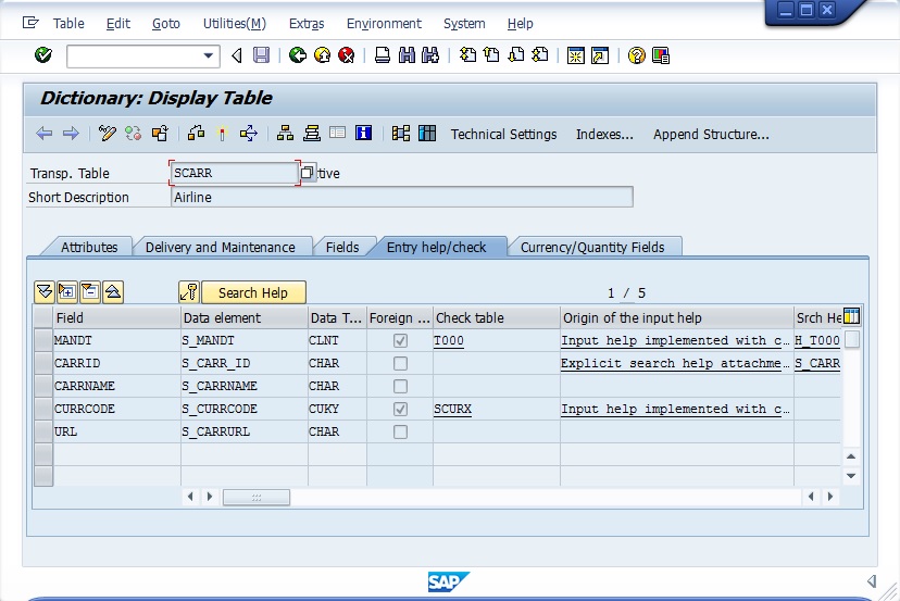 2 – No dicionário de dados na transação SE11, podemos ver a estrutura da tabela SCARR, a mesma que esta aberta no Studio SQL, porem no sistema R/3 estamos logados no mandante 001 e como podemos ver na tabela acima não existe dados para o campo MANDT para o cliente 001.