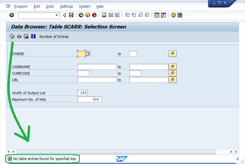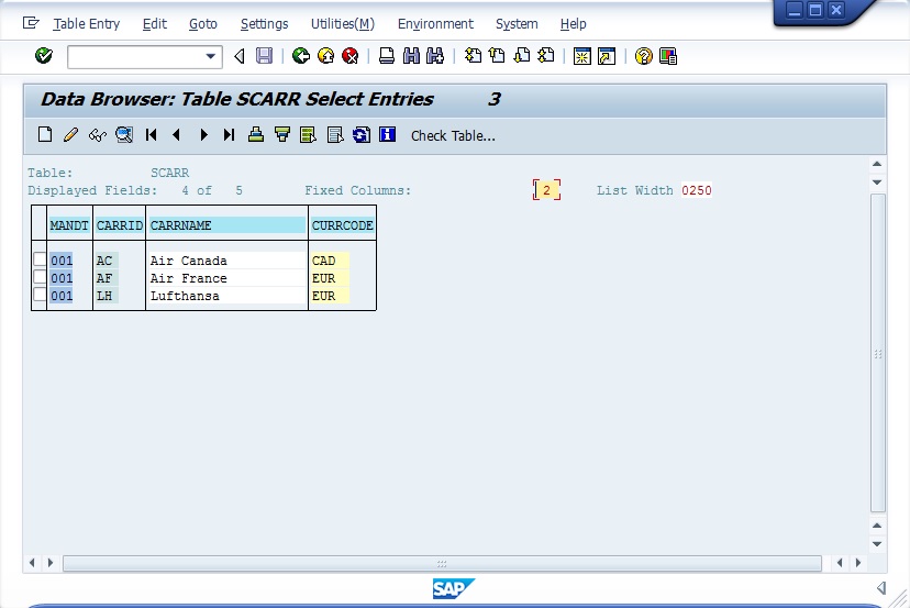 6 – Agora você pode verificar o conteúdo da tabela SCARR dentro do mandante 001 no qual estávamos logados e os dados serão encontrados.