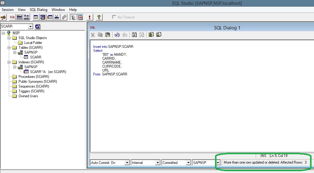 4 – Para transportar os dados para o mandante 001 basta utilizar uma instrução SQL básica contendo um comando INSERT…SELECT com um alias no campo mandante, visto que é preciso respeitar a ordem da proteção referencial do banco de dados sobre as chaves estrangeiras contidas na tabela, esta tabela por ser uma tabela pai não possui uma chave estrangeira atrelada a ela.