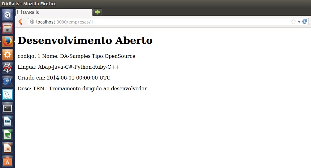 <h1><%= @empresa.nome %></h1> <p>codigo: <%= @empresa.codigo%> Nome: <%= @empresa.projeto%> Tipo:<%= @empresa.tipo%> </p> <p>Lingua: <%= @empresa.linguagem%></p> <p>Criado em: <%= @empresa.created_at%></p> <p>Desc: <%= @empresa.descricao%></p>