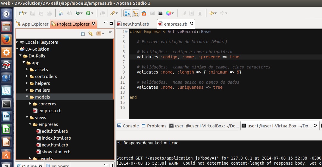 Para validar os campos do modelo precisamos usar o arquivo de modelo gerado na hora da criação do projeto, chamado empresa.rb. Também precisamos modificar o arquivo html responsável por inserir um novo registro no banco de dados, este arquivo se chama new.html.erb: