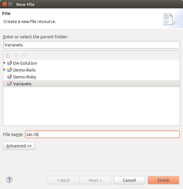 2 – Após criar o projeto, clique com o botão direito do mouse em cima do seu projeto, na arvore App Explore e escolha New File e nomeie o arquivo como var.rb: