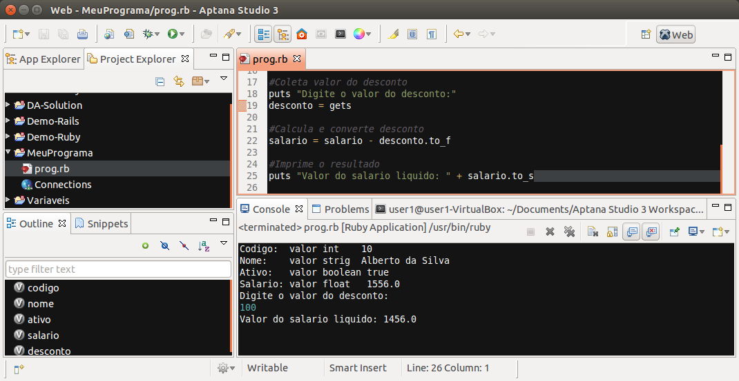 # Desenvolvimento Aberto # entrada.rb # Cria e alimenta variaveis codigo = 10 nome = "Alberto da Silva" ativo = true salario = 1556.00 #Usando mascaras e convertendo #imprime as variaveis usando mascaras puts "Codigo: valor int: " + codigo.to_s puts "Nome: valor strig: " + nome puts "Ativo: valor boolean: " + ativo.to_s puts "Salario: valor float: " + salario.to_s #Coleta valor do desconto puts "\nDigite o valor do desconto:" desconto = gets #Calcula e converte desconto salario = salario - desconto.to_f #Imprime o resultado puts "Valor do salario liquido: " + salario.to_s