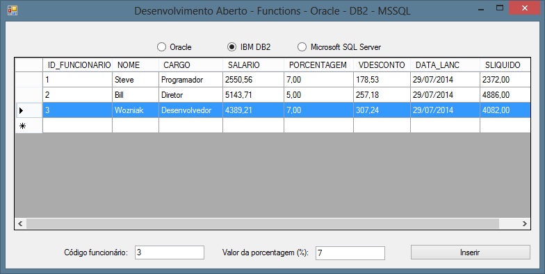 O programa abaixo é muito similar ao programa anterior que cria uma trigger, porem o calculo do campo SLIQUIDO é efetuado através de uma função do mesmo nome, na query que retorna o set de dados para a grade, você pode notar que esta função possui uma sintaxe muito semelhante as funções ou métodos do qual você já está acostumado, exceto pelo banco de dados MSSQL que necessita que o proprietário da função seja declarado antes do nome da função.