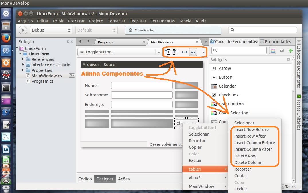 4 – Dentro das células da tabela coloque os componentes Labels, Entrys e Togglebutton, você pode adicionar ou apagar linhas e colunas na tabela clicando com o botão direito do mouse sobre ela e pode alinha-las utilizando a barra de tarefas do lado do combobox que mostra o componente com foco no qual você esta utilizando: