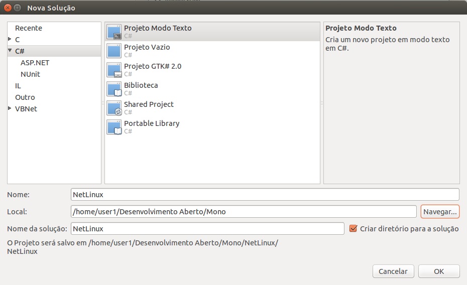 4 – Após o termino da instalação abra o programa pelo ícone do Mono, que foi adicionado automaticamente ao menu e escolha criar uma Solução de Projeto Modo Texto, que é equivalente a um projeto de Console no Visual Studio: