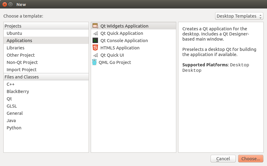 4 – Com a IDE aberta clique no menu File e escolha novo projeto, na janela de modelos de projetos, em projetos escolha Applications e selecione a opção Qt Widget Application e clique em Choose: