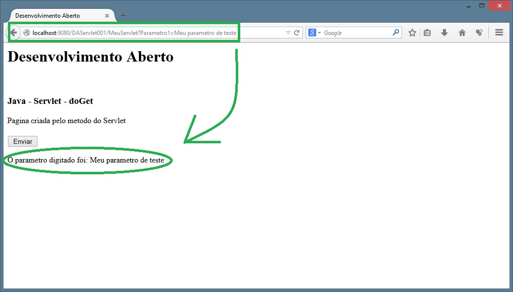 3 – Porem, o método doGet é utilizado para passar informações do navegador para o servidor, isto significa que vamos efetuar uma requisição Client-Server, vamos passar um parâmetro através do nosso browser para que o valor seja processado no servidor de aplicação Java, vamos fazer isto de um modo manual. O método para se passar parâmetros para o servidor é utilizando o caractere de “?” (interrogação) seguido sem espaço pelo nome do parâmetro adicionado do sinal de “=” (igual) e o valor desejado, caso haja mais que um parâmetros separe-os como o caractere “&” (E comercial ou Ampersand). Coloque a seguinte url e digite a tecla enter, mas atente-se a porta correta do seu servidor Tomcat: