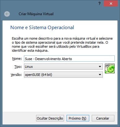 A ISO do openSuse possui as duas opções de instalação 32 e 64 bit, atente-se a versão correta, pois utilizaremos outros produtos existentes somente para a arquitetura x64. Se você não enxerga nenhum sistema operacional x64 no VirtualBox, siga as instruções de correção ou veja o FAQ para saber se seu computador suporta virtualização. A imagem abaixo possui a opção correta para sistemas 64 bit: