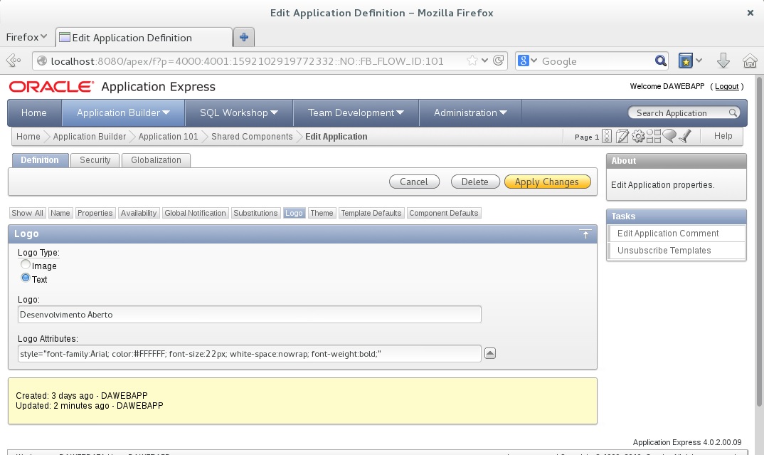 1 – Entre no Application Builder e selecione sua aplicação, em seguida vamos mudar os parâmetros globais que irão aparecer em todas as paginas, clique em Edit Application Properties: