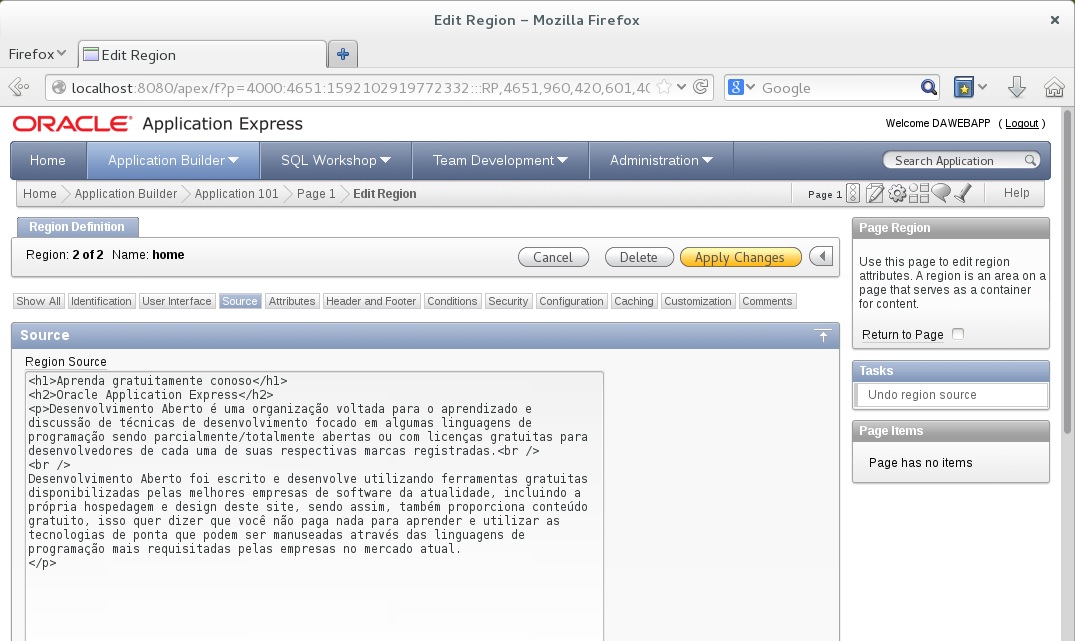Você também pode codificar suas paginas HTML individuais, isto é útil de muitas maneiras, como por exemplo criar uma pagina inicial para a aplicação. Como criamos uma aplicação à partir do zero, nossa pagina chamada Home, está vazia e toda vez que acessamos o aplicativo, encontramos uma pagina somente com o menu e uma Region, existem muitos recursos para personalizar sua aplicação siga os seguintes passos para começar com o básico: