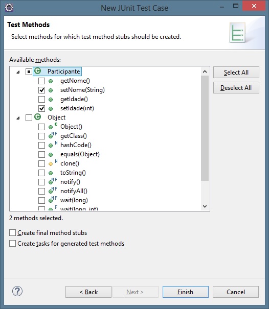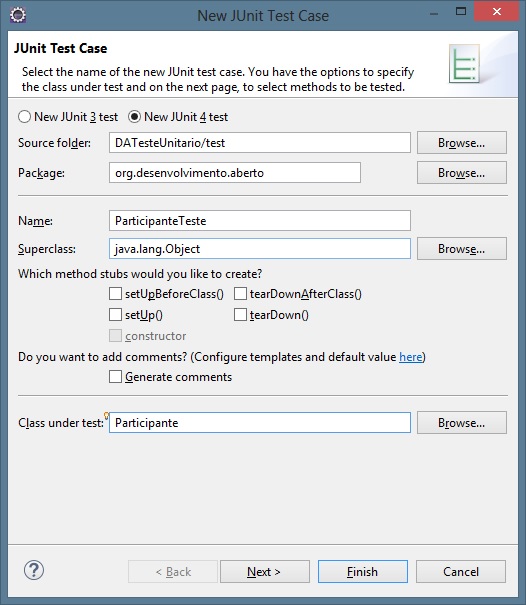 3 – Na barra de ferramentas clique em Source-Code Based e preencha os métodos para a classe ZParticipante de acordo com a classe do código abaixo: