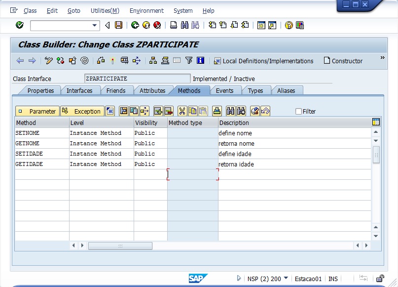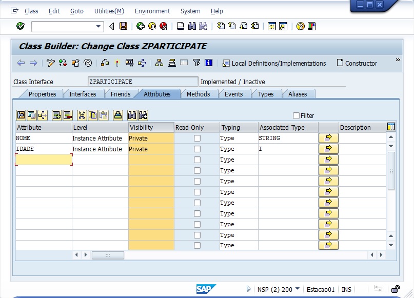 1 – Abra o Class Builder e crie uma classe chamada ZParticipante, com os seguintes atributos (você pode utilizar o código abaixo para se basear na criação da classe):