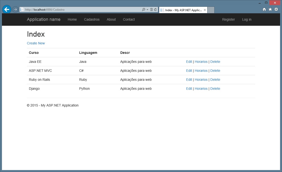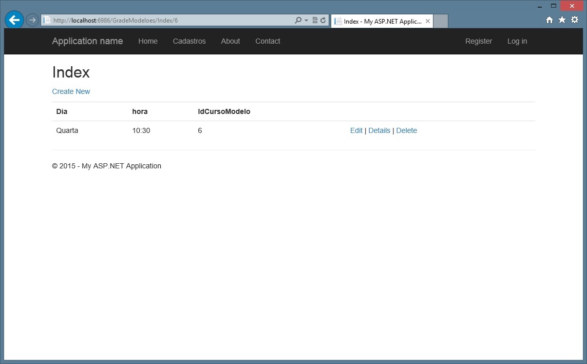 2 – Altere a visão de apresentação chama Index do controlador de cadastro e substitua o link detalhes pelo link horários e alimente os dados que desejar.