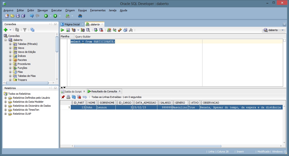 3 – Assim que os dados forem enviados o NHibernate gravará o conteúdo dos objetos no banco de dados relacional, você pode verificar na pagina que mostramos a descrição do campo cargo toda vez que utilizamos os dados da tabela de Cargos, porem na tabela Participante apenas seu identificador é gravado formando o relacionamento entre as duas tabelas: