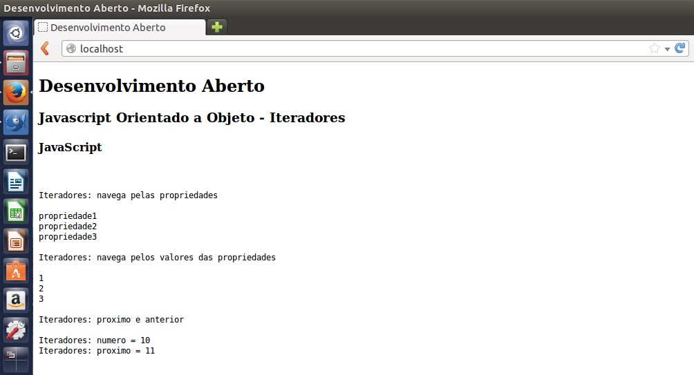 Neste exemplo escrevemos iteradores que navegam por um objeto javascript e iteram suas propriedades e os conteúdos de cada propriedade, também uma função que itera valores usando a clássica instrução next.