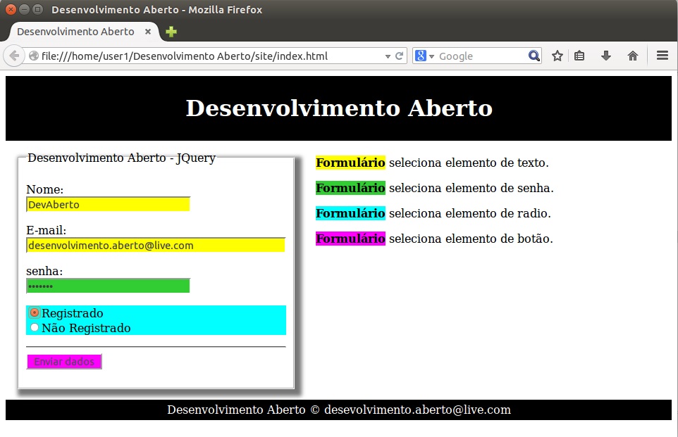 Neste exemplo criamos um cadastro utilizando os elementos HTML e os ligando ao JQuery UI.